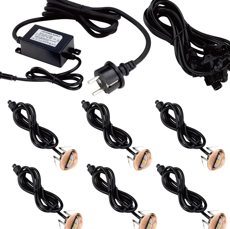 Pieni, huomaamaton ja hyvin himmennetty tehostevalaistus upotettavaan valaistukseen, joka on ihanteellinen asennettavaksi seiniin, portaisiin jne. sekä sisä- että ulkotiloihin. Täydellinen sarja, jossa 6 x 0,4 W LED -porrasvalo, ulkomuuntaja ja kaapeli.