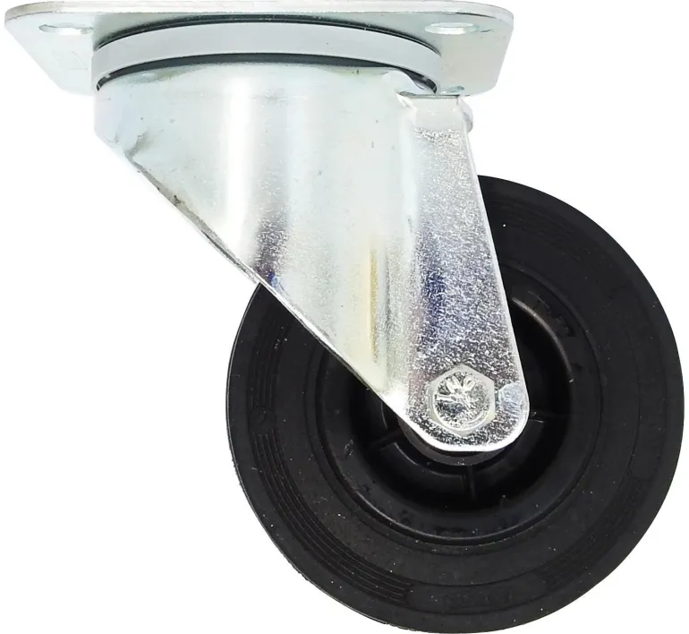 Teollisuuspyörässä on musta kumipinta ja rullalaakerointi. Pidike on valmistettu galvanoidusta teräslevystä, kaksinkertaiset kääntyvät nostolaakerit, joissa on likaantumista estävä tiivistesuojaus.