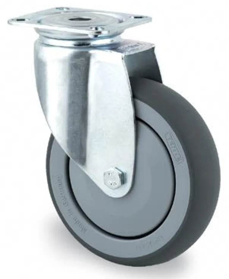 Lämpökumipinnalla varustetut laitepyörät kulkevat pehmeästi ja alustaa säästäen. Pyörässä sinkitty pidike ja kuulalaakerointi. Keskipultin tai litteän kiinnikkeen pidike.