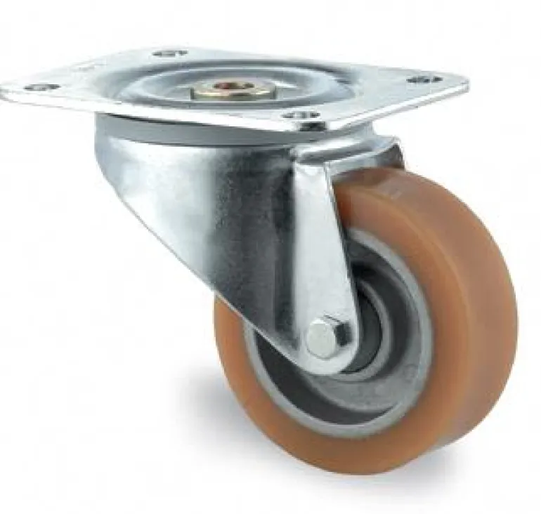 Pyörässä alumiininen keskiosa ja polyuretaanipinta. Pidike vahvaa galvanoitua terästlevyä, kaksoislaakerointi.