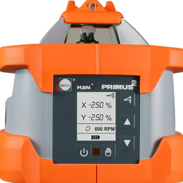Nedo Primus2 H2N:n työalue on yli 700 metriä tarkkuuden ollessa 1,5 mm/30 m. Voit asettaa halutun kaadon/kallistuksen sekä x- että y-akselille numeroin. Laservastaanottimessa Nedo H2N Commander2 on iso sja selkeä näyttö, joka näyttää kallistuksen, kierrosluvun, laserin akun latauksen yms. Vastaanotin toimii myös toimii kaukosäätimenä laserin kaikille toiminnoille. Laservastaanotin toimii kolmella alkali- tai ladattavalla AA-paristolla.