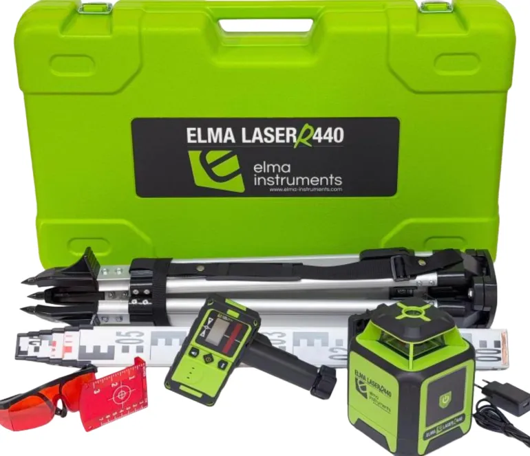 Elma R440 on itsetasoittuva pyörivä laser (rakennuslaser) lisävarusteilla. Paketti sisältää pyörivän laserin, laservastaanottimen, laturin sovittimella, laserlasit, laserkohdetaulun, säilytyslaukun ja käyttöoppaan. Erinomainen apuväline rakentamiseen ja muuhun käyttöön.