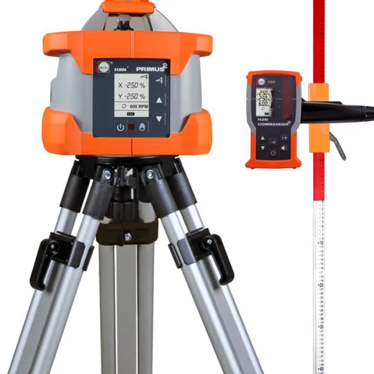 Nedo Primus2 H2N:n työalue on yli 700 metriä tarkkuuden ollessa 1,5 mm/30 m. Voit asettaa halutun kaadon/kallistuksen sekä x- että y-akselille numeroin. Laservastaanottimessa Nedo H2N Commander2 on iso sja selkeä näyttö, joka näyttää kallistuksen, kierrosluvun, laserin akun latauksen yms. Vastaanotin toimii myös toimii kaukosäätimenä laserin kaikille toiminnoille. Laservastaanotin toimii kolmella alkali- tai ladattavalla AA-paristolla.