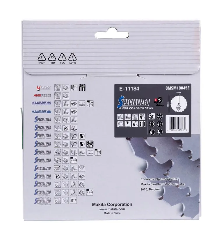 Makita EFFICUT -pyörösahanterä on erityisesti akkukäyttöisille katkaisu- ja jiirisahoille suunniteltu 190 mm ja 45-hampainen terä, joka soveltuu puulle.