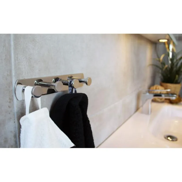 Design4Bath 8754733 on ruostumattomasta teräksestä valmistettu kiillotettu 4-osainen pyyhekoukku. Porattomaan asennukseen liimaamalla Design4Bath-liimatuotteilla. Liima ei sisälly pakkaukseen. Profile Line on sarja yksinkertaisia ja tyylikkäitä koukkuja ja wc-paperitelineitä niin koteihin kuin toimistoihin ja julkisiin wc-tiloihin. Nopea, helppo ja turvallinen asennus. Kiinniliimattu tuote on helposti irrotettavissa tai siirrettävissä tarpeen mukaan. Mitat 35 x 194 x 32,3 mm (K x L x S). Koukkujen päiden halkaisija on 20 mm.