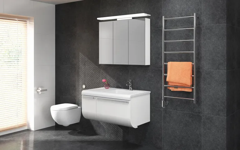 Pax Tamburin -kombikuivain pyöreillä tangoilla ja tilavalla muotoilulla, joka antaa tilaa useille pyyhkeille. Täytetään vedellä. Lämmitetään Pax-sähkövastuksella ja/tai kytketään lämmitysjärjestelmään (ei käyttöveteen).