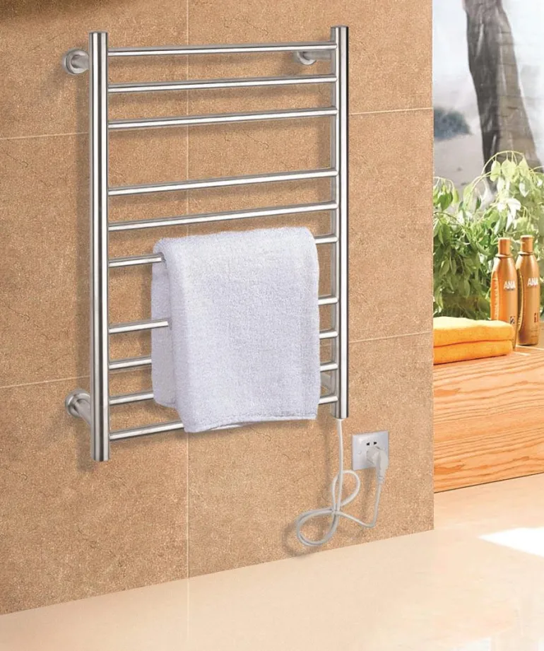Sähkötoiminen pyyhekuivain seinäasennukseen. Ruostumatonta terästä, 140 cm:n pistokkeellinen johto.