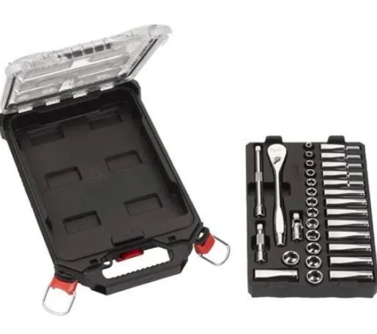 Metrinen 3/8″ räikkäkahva toimitetaan kompaktissa PACKOUT-valikoimassa, jossa on 32-osainen hylsysarja. Hylsysarja sisältää vakiohylsyjä ja pitkiä hylsyjä, koot 6–19 mm.