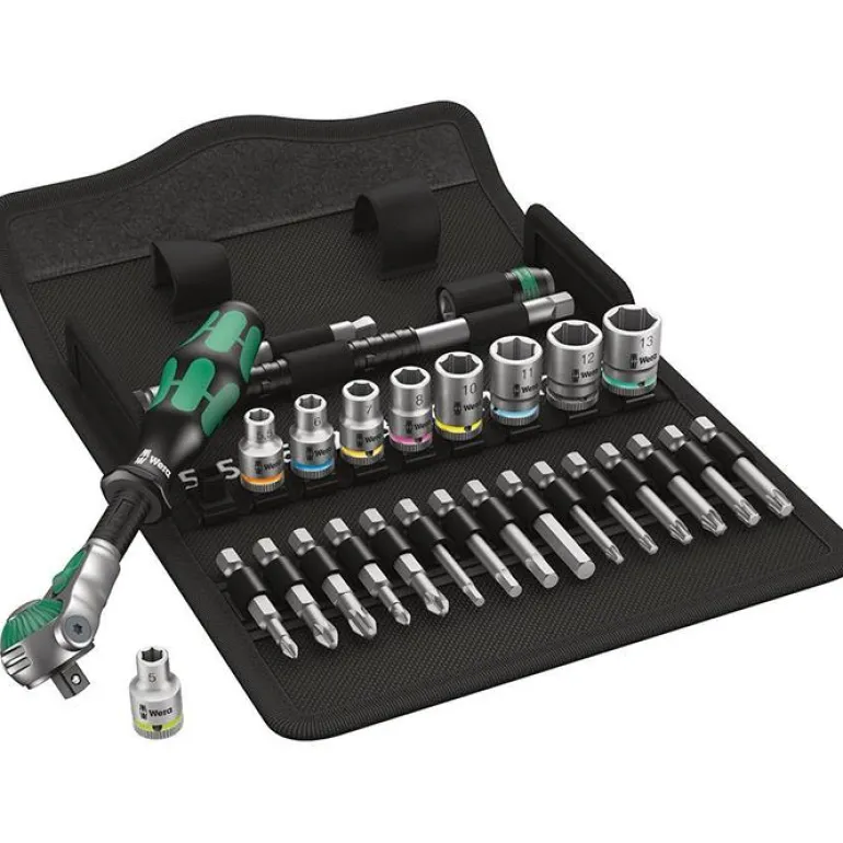 Kompakti 28-osainen räikkäavainsarja 1/4″ kiinnityksellä. Sis. räikkävarren, jatkokappaleen, sovittimen, hylsyavaimia ja kärkiä. Mukana käytännöllinen kotelo.