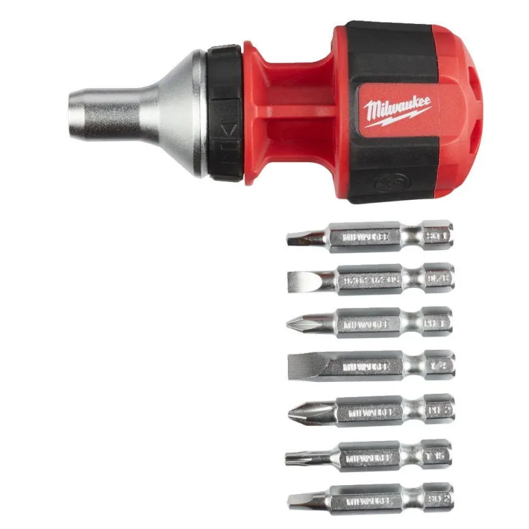 Milwaukee 8 I 1 Compact -räikkäruuvitaltta sisältää 7 ruostumattomasta teräksestä valmistettua terää. Malli sisältää kädensijaan integroidun terien säilytysratkaisun. Terissä on karkaistut kärjet. Täysin metallinen rakenne takaa tehokkaan vetovoiman, ja kaksi vetoasetusta mahdollistaa työkalun maksimaalisen hallittavuuden.