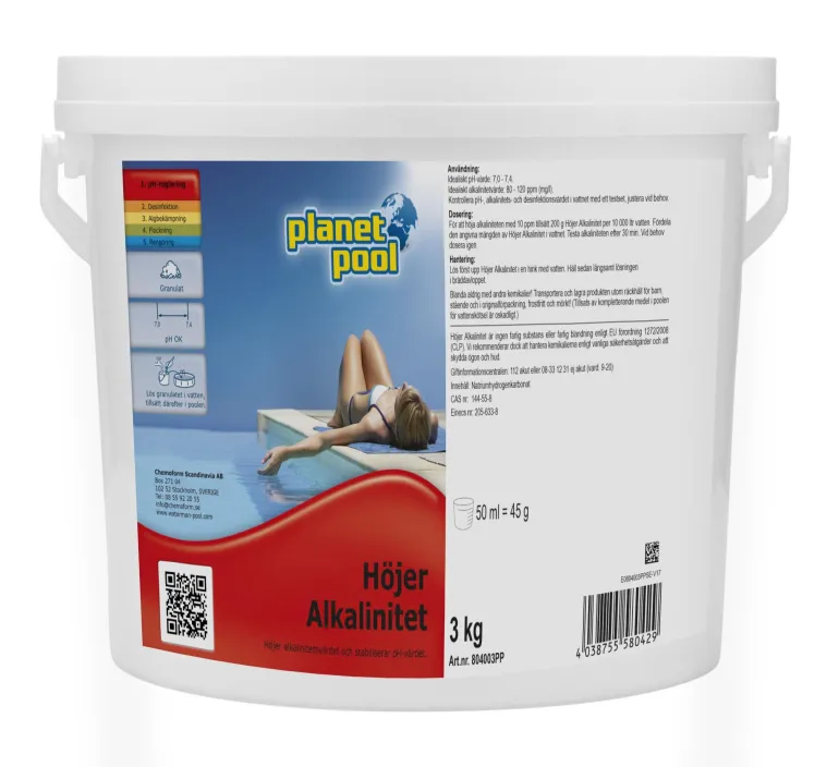 Planet Pool Alkalipitoisuuden Nostaja on rakeita, joilla nostetaan altaan veden emäksisyyttä. Oikea emäksisyysarvo on tärkeä, jotta veden pH-arvo pysyy vakaana. Ihanteellinen emäksisyysarvo on 80–120 mg/l (ppm). Toimitetaan kätevässä 3 kg:n sangossa, jossa on kantokahva.