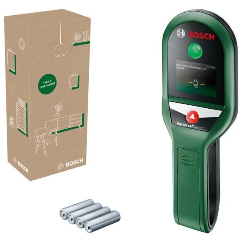 Bosch UniversalDetect tutkii kiviseinät, väliseinät, sisäkatot ja lattiat jopa 10 cm:n syvyydeltä. Se löytää metalliesteet, jännitteiset yksivaihejohdot ja puukoolaukset. Tämä vähentää vahinkojen riskiä poraamisessa, kun ripustat tauluja ja valaisimia. Tämä kätevä rakenneilmaisin ei tarvitse manuaalista kalibrointia – käynnistä laite ja aloita tutkinta välittömästi. Hyödylliset animaatiot neuvovat laitteen käytön kohta kohdalta. Sen liikennevalomainen LED-merkkivalojärjestelmä ja valinnainen äänimerkki ilmoittavat havaitun esteen sijainnin. Helppokäyttöisen UniversalDetectin keskellä on reikä, jonka avulla voit merkitä porauspaikat tarkasti.