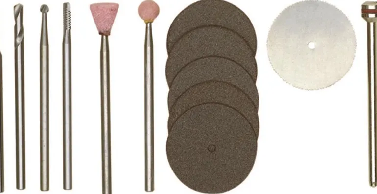 Mallirakennussarja, 13 osaa. Leikkaamiseen, jyrsintään, kiillotukseen ja poraamiseen. 1 jyrsin sekä pallomainen Ø 2,3 mm että yksi sylinterin muotoinen 2,3 mm. Jalokorundihiontapuikko, 1 pallomainen 5,0 mm, 1 kartiomainen 5,0 mm, 1 mikropora 1,0 mm ja 2,3 mm. 5 katkaisulaikkaa Ø 22 mm. Yksi sahanterä Ø 22 mm ja pidike Ø 2,35 mm.