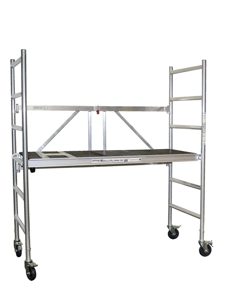 Alumiiniteline sekä sisä- että ulkotöihin. Rakennustelineen alustan koko on 1600 x 600 mm. Teline toimitetaan vakiona Ø 100 mm pyörillä. Rullateline on kätevä siellä, missä tilaa on rajoitetusti. Perusmoduuli, luukullinen taso ja 4 pyörää. Kun kaikki moduulit on asennettu, 5,8 metriä, telineen pohjassa on oltava 40 kg painolasti. Enimmäiskuormitus on 150 kg/m2.