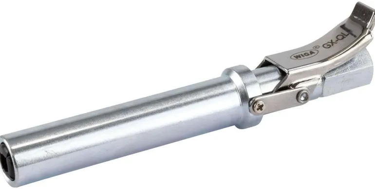 Pitkä voitelusuutin rasvaprässille. Suuttimessa on pikasulku.