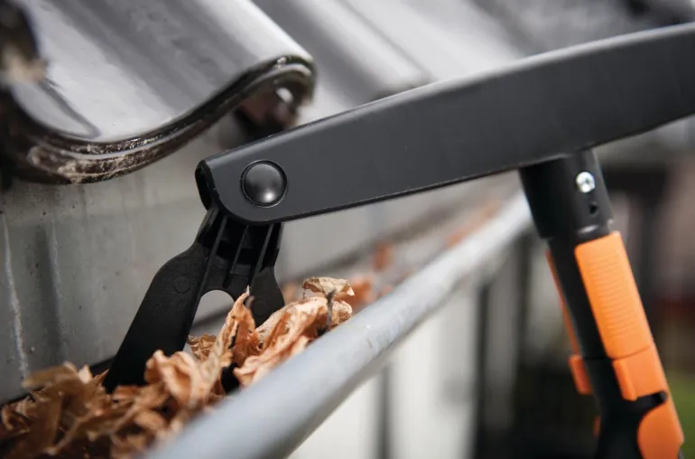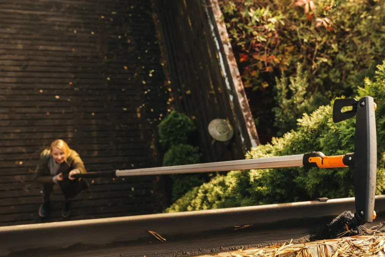 Räystäskourun puhdistaja, harjan ja raaputtimen yhdistelmä puhdistaa räystäskourut tehokkaasti.