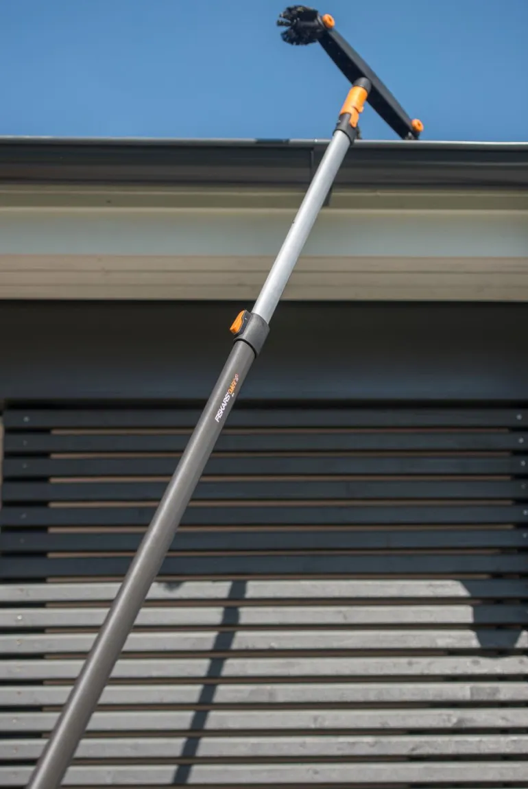 Fiskars QuikFit 1001414 Räystäskourun puhdistaja, harjan ja raaputtimen yhdistelmä puhdistaa räystäskourut tehokkaasti.