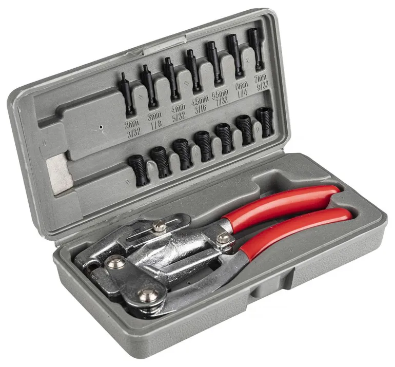 Pela 513486 on reikäpihtisetti 2-7 mm (hole punsch) peltilevyn rei`ittämiseen. Vastakappaleet vaihdettavissa erilaisia reikäsyvyyksiä varten.