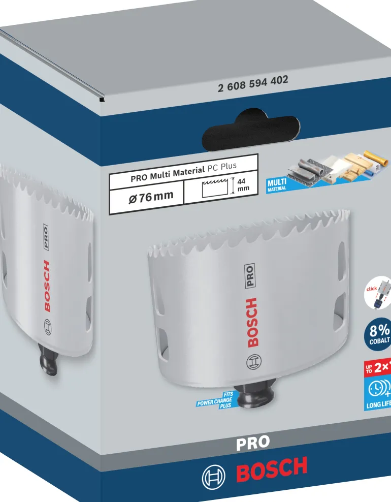 Bosch Professional PRO Multi Material PC Plus -reikäsaha akku- ja iskuporakoneille. Pitkä käyttöikä sahattaessa reikiä eri materiaaleihin. Sopii materiaaleille pehmeä puu, kipsilevy, muovit, metalliputket- ja profiilit ja ei-rautametallit. Sähkö- ja putkiasentajat pitävät reikäsahoja korvaamattomina putkien, sähkökoteloiden ja upotetun valaistuksen asentamisessa. Mieluiten he haluavat pitää mukanaan vain yhdenlaisen reikäsahan sisäasennuksiin liittyviä haasteita ja materiaaleja varten. Siksi Bosch Professional tarjoaa PRO Multi Material -reikäsahan. Kestää jopa 2 kertaa pidempään kuin tavallinen HSS M3 -reikäsaha. PRO Multi Material -reikäsahassa on parannettu hampaiden muotoilu nopean ja tasaisen leikkuun ja runsaskobolttisten HSS-seoshampaiden pitkän käyttöiän varmistamiseksi. Se leikkaa teräsverhousta ja kipsilevyä tehokkaasti. Power Change plus -mekanismi nopeuttaa reikäsahojen ja esiporanterien vaihtoa ja helpottaa materiaalitulppien irrottamista. Avaimettomaan Bosch Power Change Plus -kiinnitysjärjestelmään: tarkkaan ja lujaan kiinnitykseen.