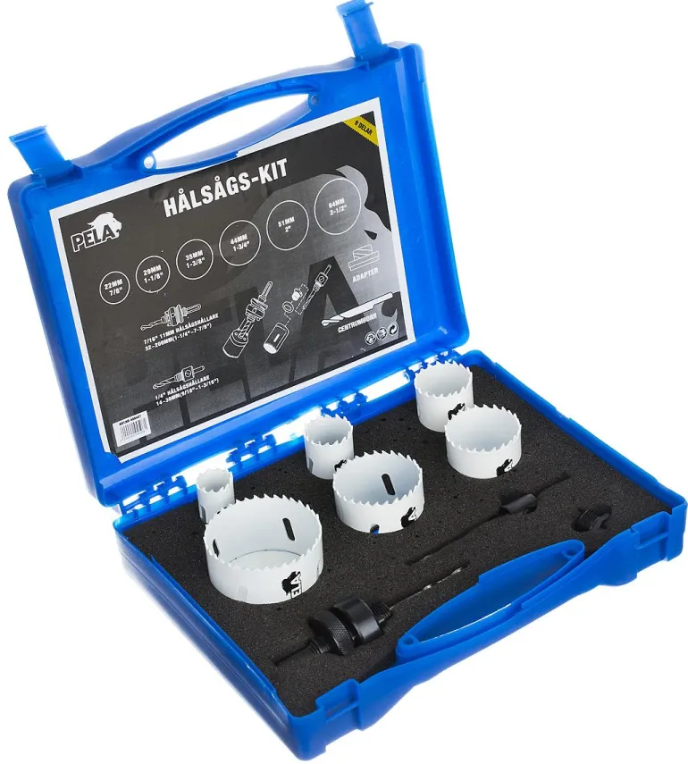 PELAn 9-osainen reikäsahasarja, joka sisältää 6 reikäsahaa (halkaisijat 22, 29, 35, 44, 51 ja 64 mm). Sarja sisältää myös kaksi reikäsahanpidikettä (14-30 mm ja 32-200 mm) sekä sovittimen ja keskiöporanterän.
