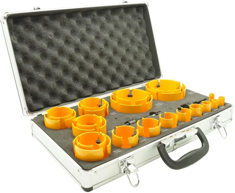 Syvä reikäsahamalli kovametallihampailla. Sarjat, jossa reikäsahat Yleiskäyttö HM. Eri asennuksiin ja työtehtäviin sovitetut kokoyhdistelmät. Toimitetaan käytännöllisessä alumiinilaukussa. Jopa 5 kertaa nopeampi kuin bimetallireikäsaha kaikissa ei-alumiini-, rauta- ja teräsmateriaaleissa.Ei suositella metallien poraamiseen. Voidaan käyttää kovametalliterällä varustetun keskiöporan kanssa kivi-/kalkkimateriaalille kovuuteen 6 asti. Reikäsahasarja HM Yleiskäyttöinen:16-19-20-25-32-35-41-51-54-56-57-60-64-71-73-74-76-83-92-111-114 mm reikäsahat sekä pidin 3/8″ (10 mm) 7/16″ (11mm) varrella ja ylimääräisellä keskiöporalla. Käytä reikää reikään porattaessa sovitinta 410498.