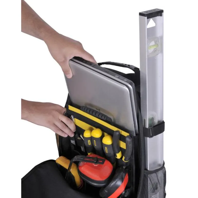 Reppu, jossa irrotettava jakaja ja 15 kg:n kapasiteetti. 600 x 600 denierin kestävä kangas pidentää käyttöikää. Irrotettava taskullinen jakaja usein käytettäville työkaluille. Pehmustettu takaosa tekee kantamisesta ergonomista ja mukavaa. Erillinen tila sähkötyökaluille tai kannettavalle tietokoneelle. Pieni lokero edessä henkilökohtaisille tavaroille.