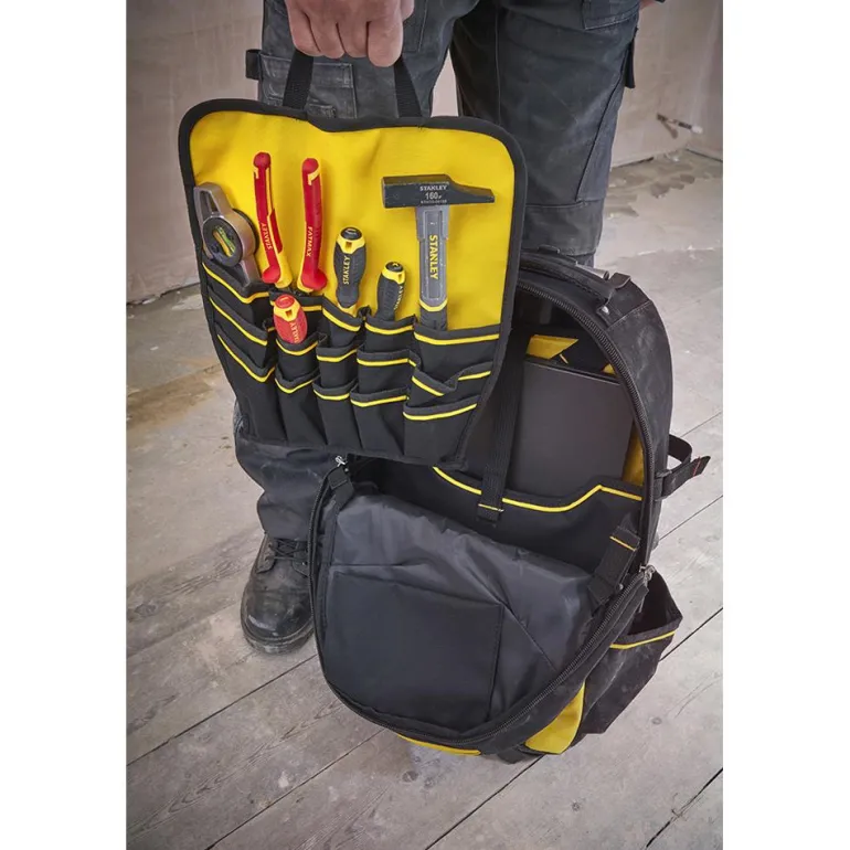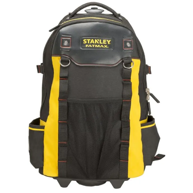 STANLEY 1-79-215 on kestävästä 600x 600 denierin kankaasta valmistettu reppu, jossa on kaksisuuntainen vetoketju sekä läpinäkyvä lokero ja paljon helppokäyttöisiä silmukoita pakkaamisen avuksi. Silmukat lisäävät kiinnitysvaihtoehtoja. Helppo pääsy henkilökohtaisiin tavaroihin, jotka ovat eri tilassa. Irrotettava jakaka, jossa on paljon taskuja erilaisille työkaluille. Jäykkä rakenne pysyy auki, joten työkalut ovat helposti saatavilla. Erillinen, vankka lokero sähkötyökaluille tai kannettavalle tietokoneelle. Pyörällinen reppu on täydellinen yhdistelmä työkalujen helppoon ja mukavaan kuljettamiseen. Vetokahva pyörillä kuljettamista varten.