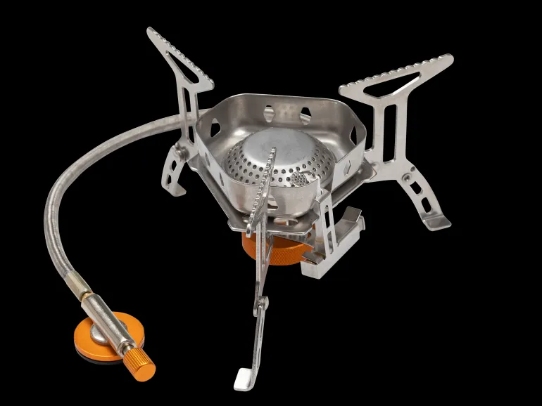 Tehokas retkikaasukeitin, joka liitetään kaasupulloon letkulla. Pietsosytyttimellä.