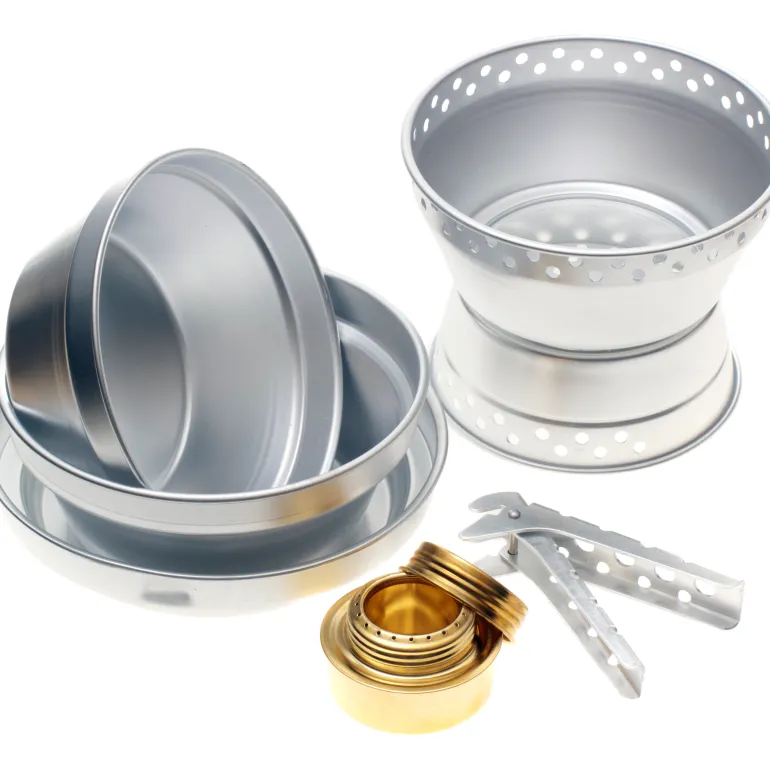 Retkikeittiö, jossa on poltin, kaksi kattilaa, paistinpannu ja kahvat. Paistinpannua voidaan käyttää kattiloiden kantena. Retkikeittiö on hyödyllinen kaikissa sääolosuhteissa ja voidaan pakata pieneen tilaan.