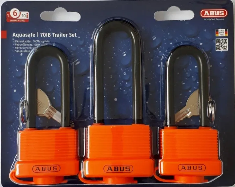 Riippulukko 3-pakkaus. Toimitetaan neljällä avaimella, yhteislukitus. Riippulukko on muovipäällystetty suojaamaan korroosiolta ja naarmuilta. Pakkaus sisältää kaksi 45 mm leveää lukkoa 63 mm korkuisella sangalla, ja yksi 50 mm leveä lukko 80 mm korkuisella sangalla.