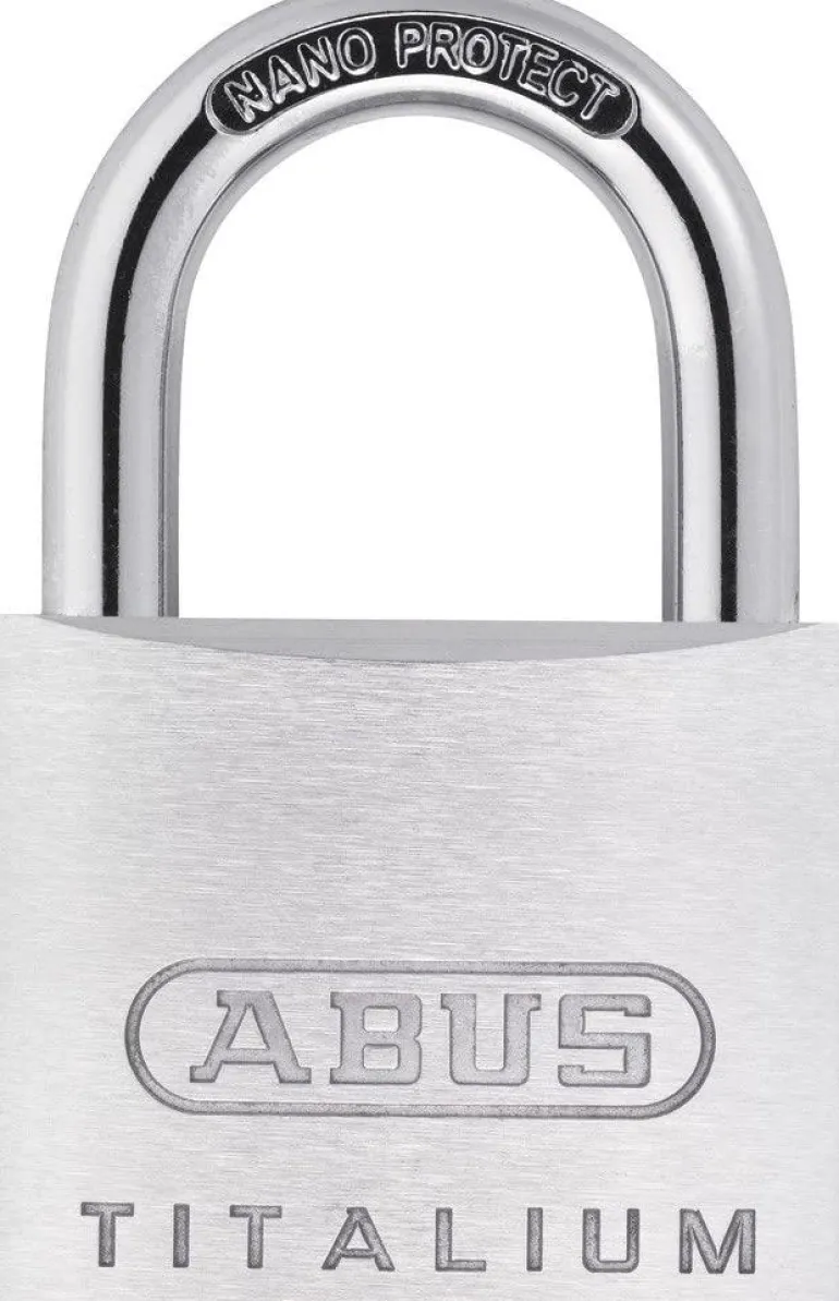 ABUS riippulukko, jonka leveys on 60 mm, karkaistu terässanka ja valmistettu titalium-alumiiniseoksesta. Riippulukko on erittäin korroosiosuojattu.