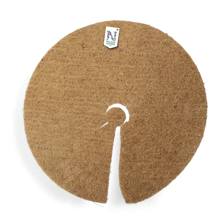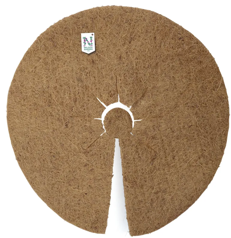 Pyöreä kookoskuitumatto estää rikkaruohon kasvua ja pitää kosteuden maassa. Keskeltä avautuu halkio, jonka ansiosta matto on helppo asettaa puun tai pensaan ympärille.