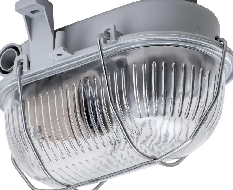 Autotallivalaisin, hehkulampulle. Valaisimessa on muovirunko, strukturoidusta lasista valmistettu kupu ja alumiiniheijastin. Kaapelin sisäänvienti, toisessa päässä ohjausnippa. Sinkitty teräsristikko, joka voidaan avata ilman työkaluja. Teräsristikko ja muovikanta. Hyväksytty ulkokäyttöön.