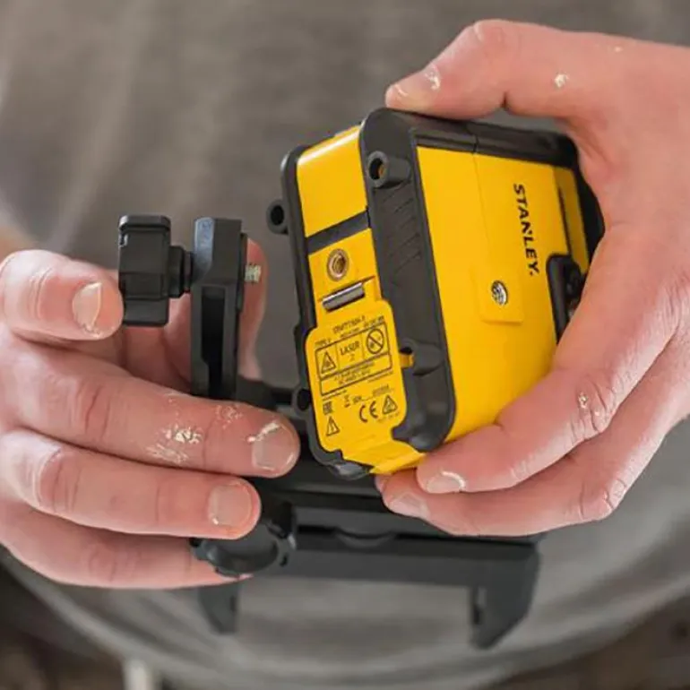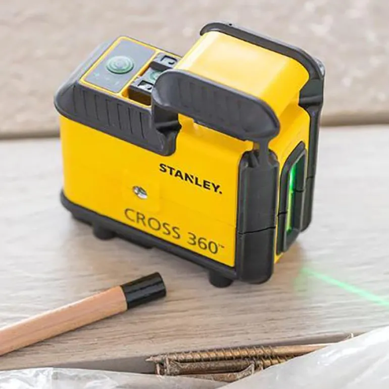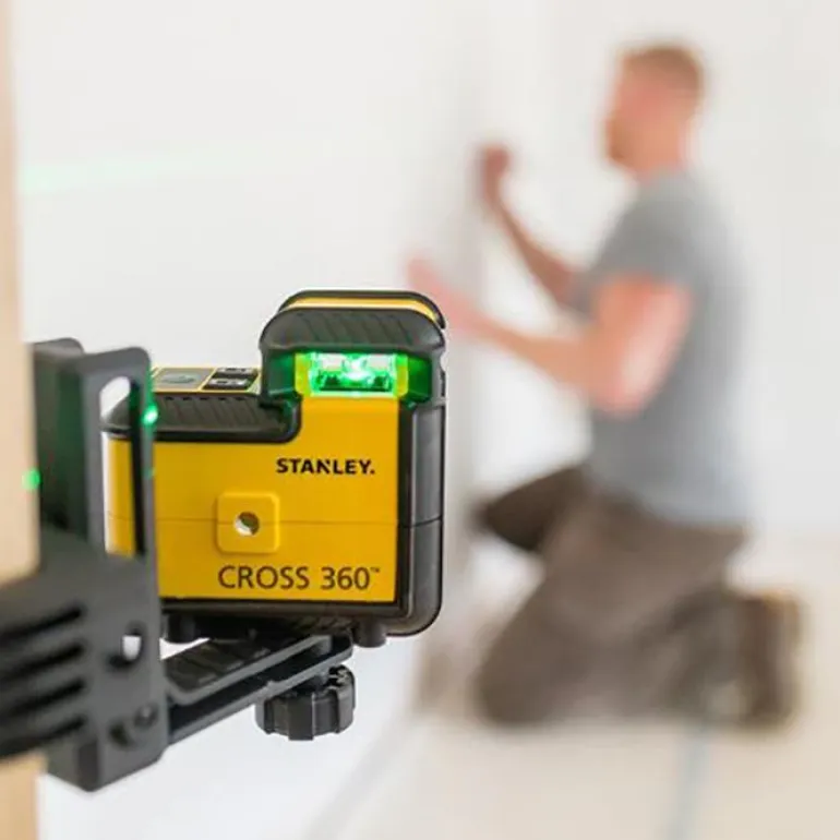 Ristilaser, tarkkuus +/- 4mm @ 10 m. Vihreä lasersäde tarjoaa suuremman työskentelyalueen ja paremman näkyvyyden.