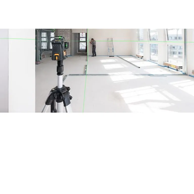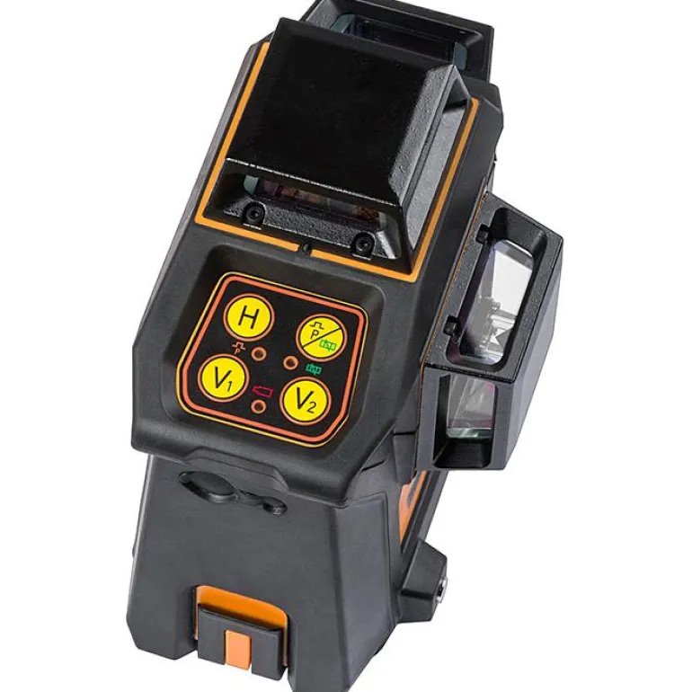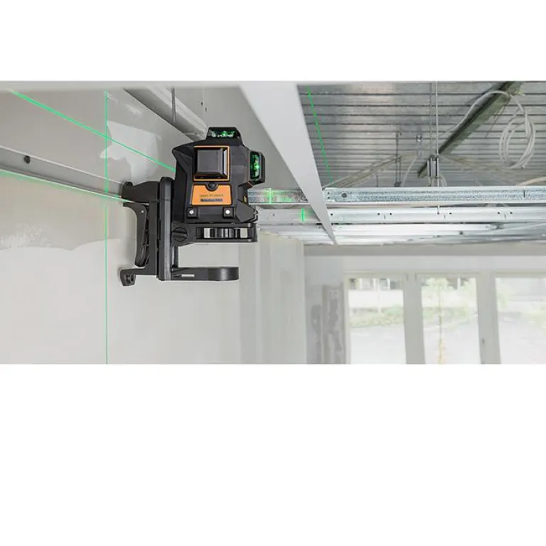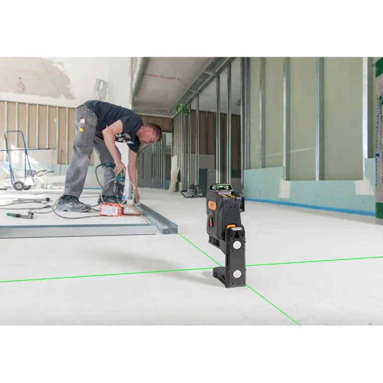 Ristilaser kolmella 360° laserlinjalla, jotka muodostavat 6 laserristiä linjojen kohdatessa 90° seinää, kattoa ja lattiaa vasten. Toimintasäde on 80 m tai jopa 140 m laservastaanottimen kanssa. Itsevaaitusalue jopa 3°.