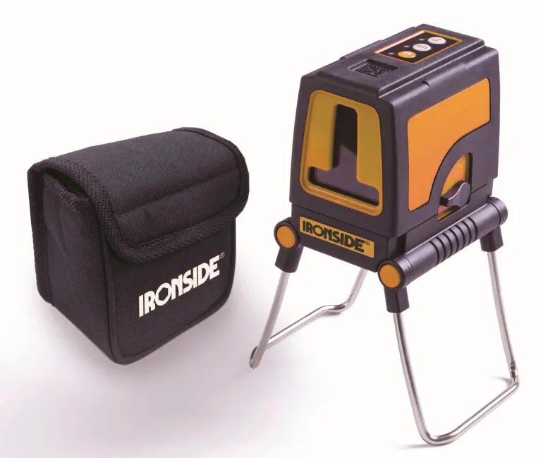 Linjalaser, joka tuottaa sekä vaaka- että pystylinjan. Toiminta-alue sisätiloissa max.