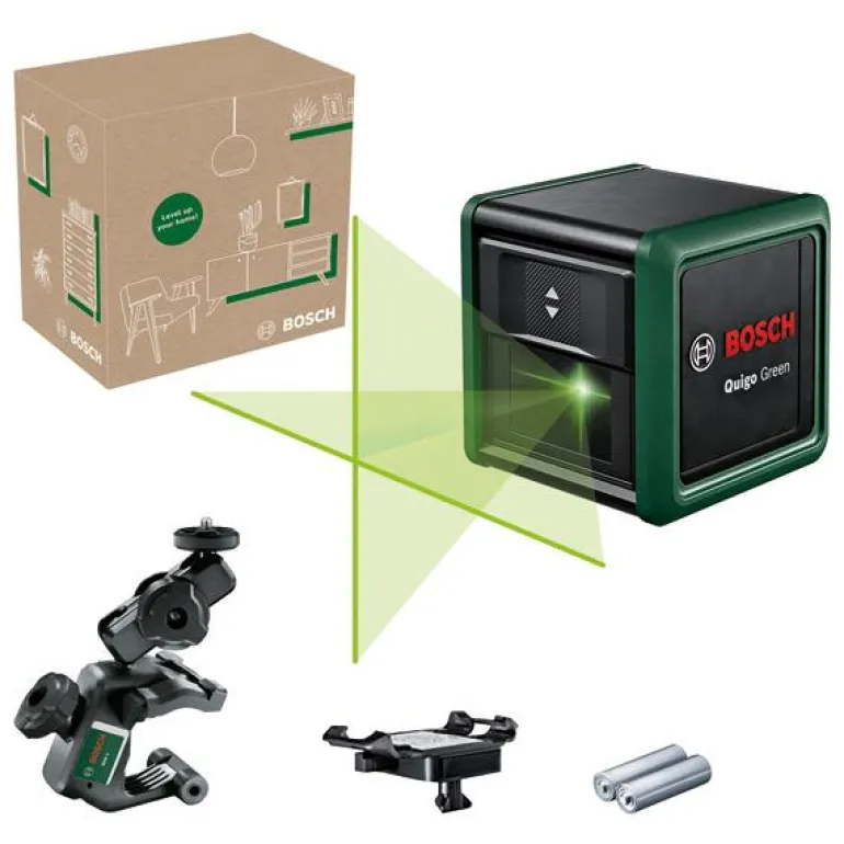 Bosch Quigo Green -ristilinjalaser, joka varmistaa hyvän näkyvyyden ja helpon ohjauksen kaikissa tee-se-itse-projekteissa. Selkeästi näkyvien, vihreiden ristilinjojen ansiosta Quigo Green on optimaalinen kohdistusratkaisu erittäin kirkkaissa valo-olosuhteissa.