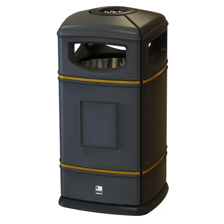 Perinteinen roska-astia ulkokäyttöön. Useita aukkoja, jotka mahdollistavat roskien heittämisen eri suunnista.