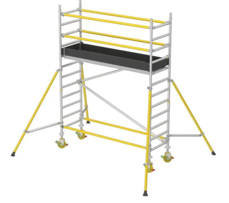 Kapea rullateline limittäisillä tuilla. Voit valita kokonaisen telineratkaisun, joka sisältää työtason, porrastikkaat, poikittaislevyn, säädettävät pyörät ja tukijalat, tai aloittaa peruspaketista ja täydentää sitä laajennuspaketeilla.