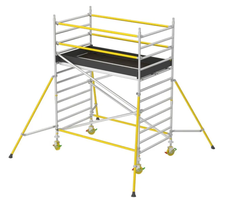 Vankka ja helposti asennettava rullateline, jossa on limittäiset tukirakenteet ja harkitut ratkaisut. Voidaan tilata kahdella alustalla, kaltevilla askelmilla metrin välein, kahdella yläalustalla, poikittaislevyllä, säädettävillä pyörillä (200 mm) ja tukijaloilla. On myös mahdollista aloittaa peruspaketilla ja täydentää sitä lisäpaketeilla haluttuun korkeuteen asti myöhemmin. (Kuvassa on peruspakkaus.)