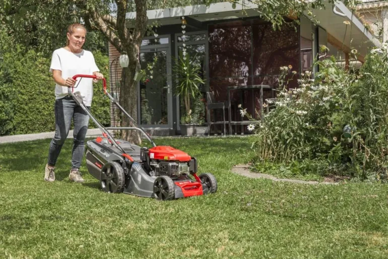 Erikoissuunniteltu runko mahdollistaa leveämmän leikkuualueen. Isot pyörät takaavat hyvän pidon. Itsevetävä (takavetoinen) ruoholeikkuri mahdollistaa hyvän liikkuvuuden myös haastavammilla alustoilla ja käytettäessä keruutoimintoa. Toimintoina tavallinen leikkuu, bioleikkuu, keruu sekä taaksepuhallus. Leikkuukorkeus säädettävissä tukevalla vivulla kaikille pyörille.