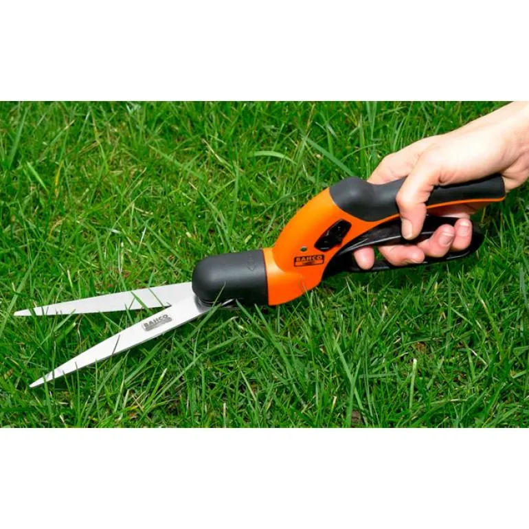 Bahco GS-180-F, ruohosakset, joissa itseteroittuva terä ja kääntyvä pää. Nurmikon reunan trimmaukseen. Saksien kokonaispituus on 375 mm, pehmeä ja luistamaton pinnoite, alakahvassa sormia suojaava lenkki. Helppo kääntää erilaisiin asentoihin, erilaisten kulmien leikkaaminen on vaivatonta.