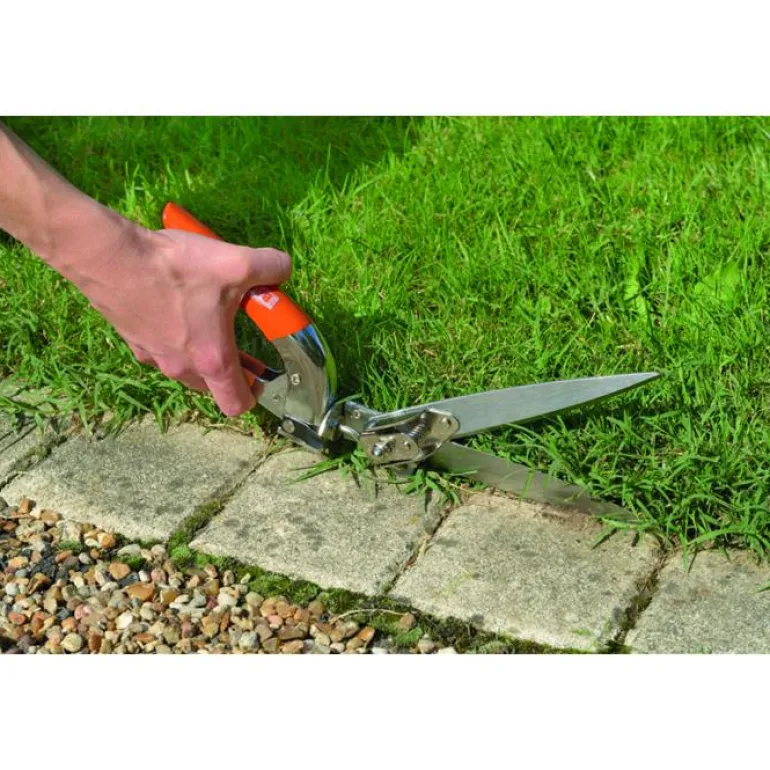 Ruohosakset, joiden terä on käännettävissä kolmeen asentoon, jolloin nurkkamuotojen ja reunojen siistiminen on vaivatonta. Saksien pituus 355 mm, tarkasti suunnatut terät ovat itsehioutuvat.