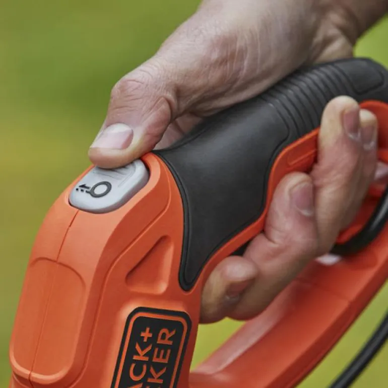 Black & Decker BESTE628-QS on 550 W ruohotrimmeri, jonka leikkuuleveys on 28 cm. Trimmerin leikkuunopeus on 7500 kierr./min ja se on varustettu POWERCOMMANDILLA, joka tarjoaa helpon langansyötön napin painalluksella. Kääntyvä trimmauspää auttaa tasoittamaan reunoja.