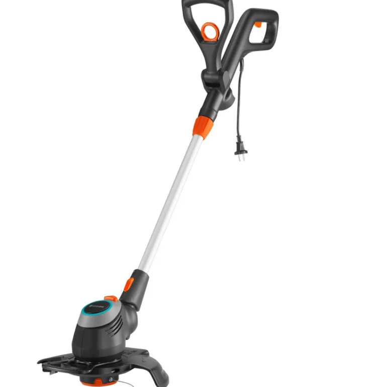 Kahvaa ja teleskooppivartta voidaan säätää, jotta voit työskennellä mukavassa asennossa. Leikkuupää voidaan kallistaa niin, että voit trimmata vaikeasti saavutettavissa paikoissa, kuten puutarhakalusteiden alta. Lisäksi reunaleikkuutoiminto on erittäin käytännöllinen. Sen avulla voit kallistaa trimmerin päätä 90 astetta, jotta voit leikata helposti nurmikon reunaa pitkin. Esiin taitettava kasvisuoja varmistaa, että nurmikon reunalla olevat roikkuvat kasvit ovat suojattuja.