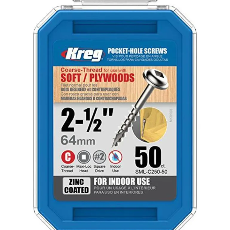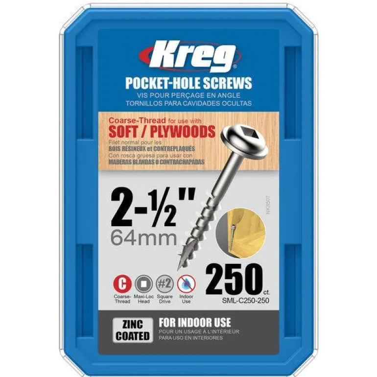 Kreg SML-C250-250 on 250 kpl harvakierteisiä galvanoituja 65 mm:n ruuveja 38 mm:n levyyn, Maxi-Loc-pää. Soveltuu erilaisiin sisätiloissa toteutettaviin projekteihin, joissa on jonkin verran altistumista säälle. Sinkkiruuveilla on rajoitettu korroosiosuoja.