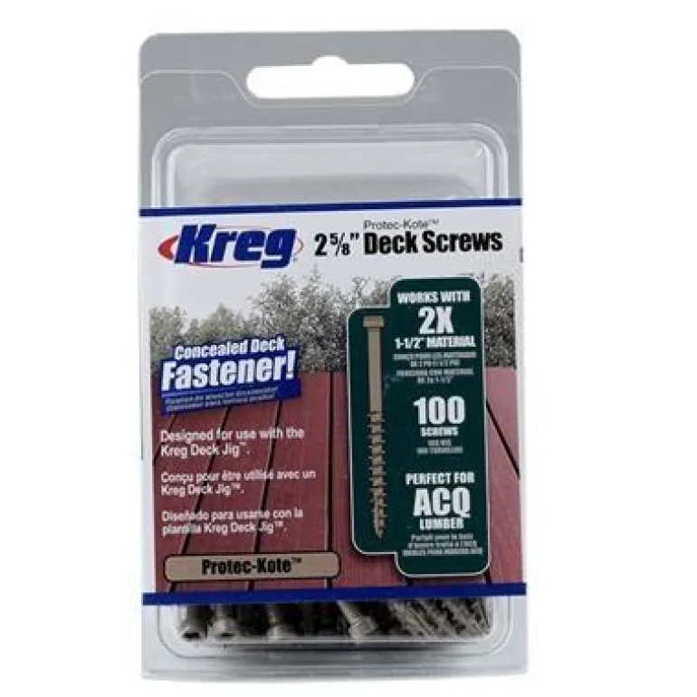 Kreg SDK-C262W-525 on 525 kpl 67 mm:n ruuveja ulkokäyttöön, 30-40 mm paksuille terassilaudoille. Protec-Kote-suojaus, väri sulautuu painekyllästettyyn terassilautaan.