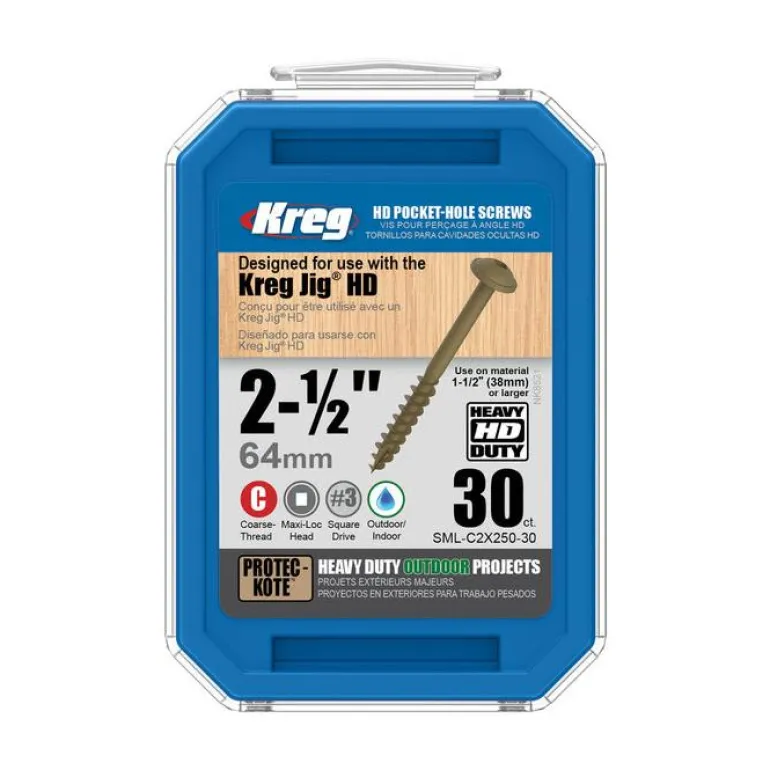 125 kpl ulkokäyttöön tarkoitettuja ruuveja , 64 mm, 3 korroosiosuojakerrosta. Ruuvi on optimoitu käytettäväksi Kreg Jig HD:n kanssa.