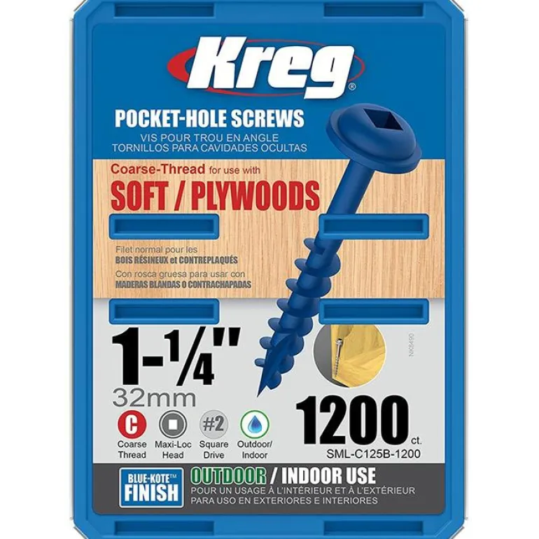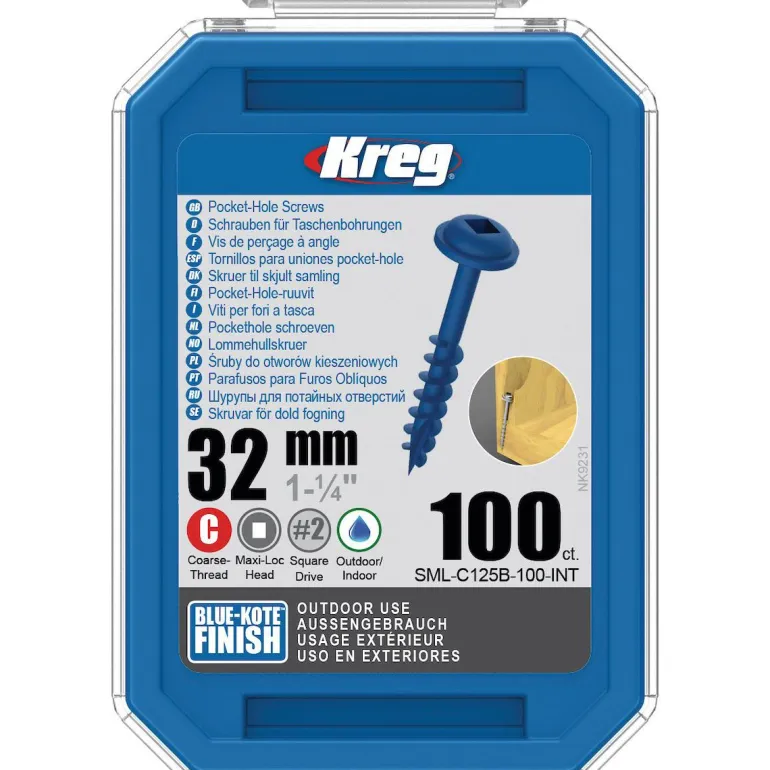 Kreg SML-C125B-100 on 100 kpl harvakierteisiä 32 mm:n ruuveja 19 mm:n levyille. Blue-Kote sopii sisä- ja ulkokäyttöön.