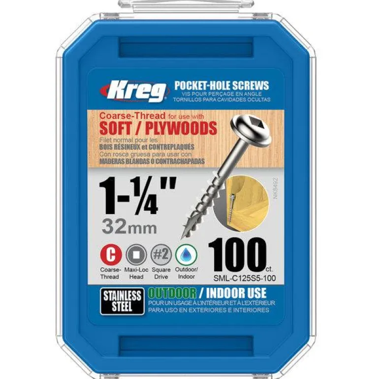 Kreg SML-C125S5-100 on ruostumattomasta teräksestä valmistettu 32 mm:n ruuvi, 100 kpl. Suunniteltu erityisesti sovelluksiin, joissa on runsaasti vettä tai muita äärimmäisen syövyttäviä elementtejä. Ruuvissa on Maxi-Loc-pää.